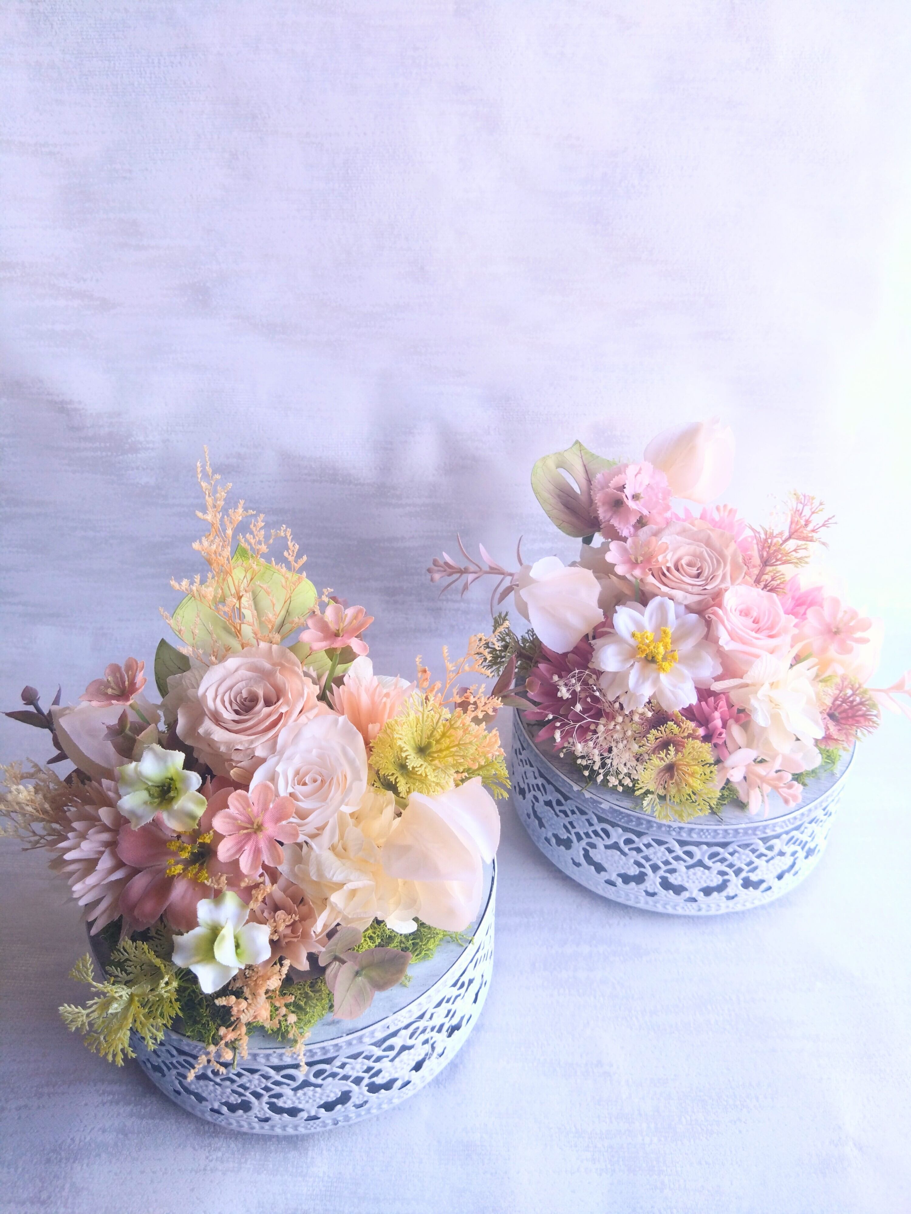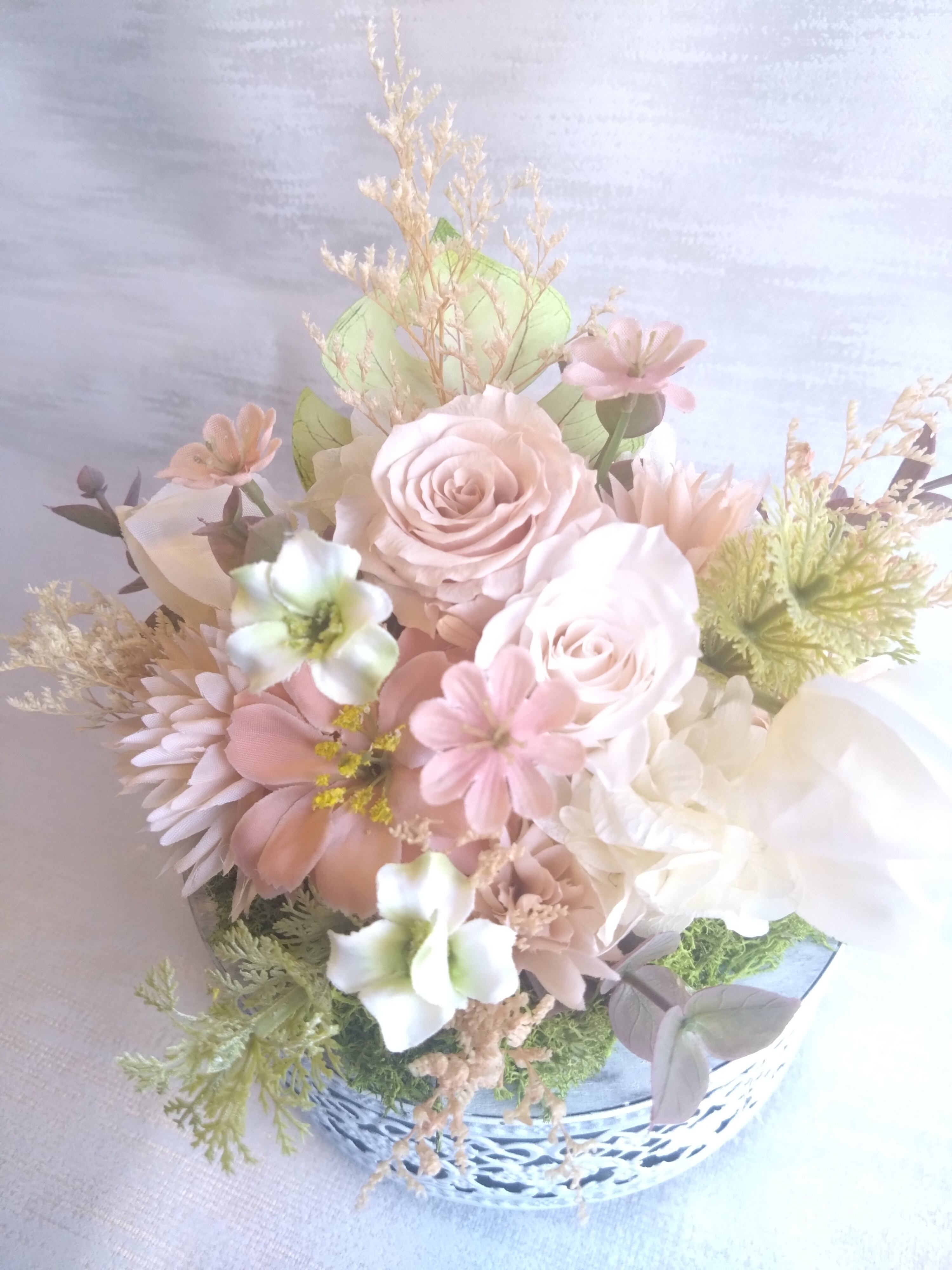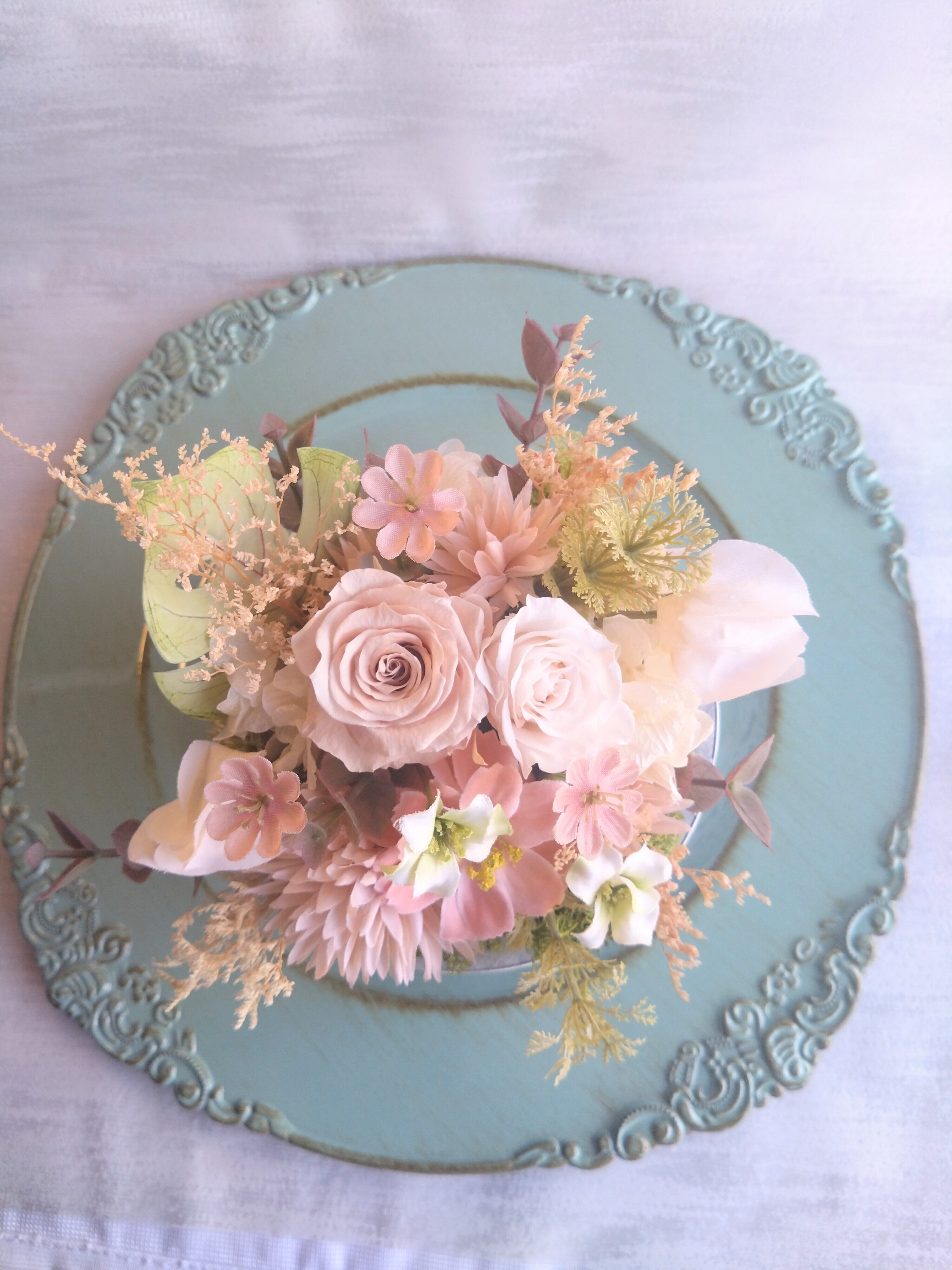 アンティーク調のシックなレース模様の円形の器に、優しい雰囲気のベージュピンクのアレンジです。